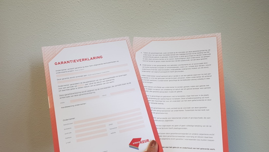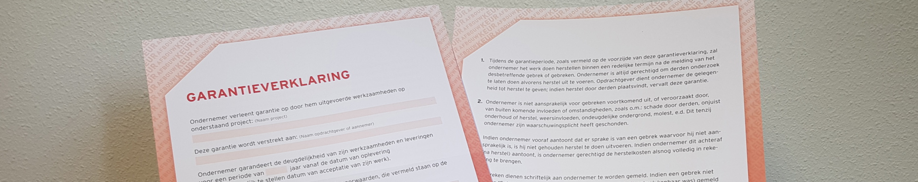 De Afbouwkeur ondernemer garandeert met het afgegeven garantiebewijs vanaf de datum van oplevering de deugdelijkheid van zijn werkzaamheden en leveringen. Afhankelijk van de aard van de werkzaamheden wordt de garantietermijn in de garantieverklaring benoemd. Tijdens de garantieperiode zal de ondernemer het werk binnen een redelijke termijn na de melding van een gebrek herstellen. De voorwaarden staan helder beschreven op het afgegeven garantiebewijs.