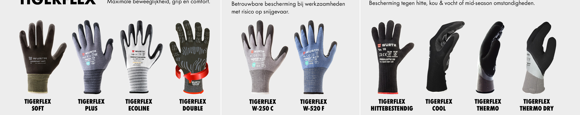 De Tigerflex Plus Ecoline maakt deel uit van de Tigerflex‑handschoenenfamilie van Würth. Deze productlijn omvat verschillende modellen, zoals montagehandschoenen, snijbestendige én thermische handschoenen. Door deze opbouw kan per werksituatie een passende handschoen worden gekozen, met aandacht voor veiligheid, comfort en functionaliteit.