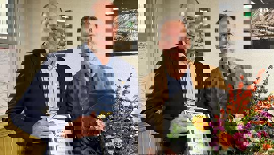 De bedoeling was om aftredend bestuurslid Peter Veenstra tijdens de ledenbijeenkomst van de hoofdsector Natuursteen op 7 november te benoemen tot Erelid van NOA. Helaas werd een paar dagen daarvoor bekend dat Peter niet bij de vergadering aanwezig kon zijn. NOA-voorzitter John Kerstens en verenigingsmanager Ester Litjes sprongen daarop in de auto naar het Groningse Uithuizermeeden en verrasten Peter op kantoor.