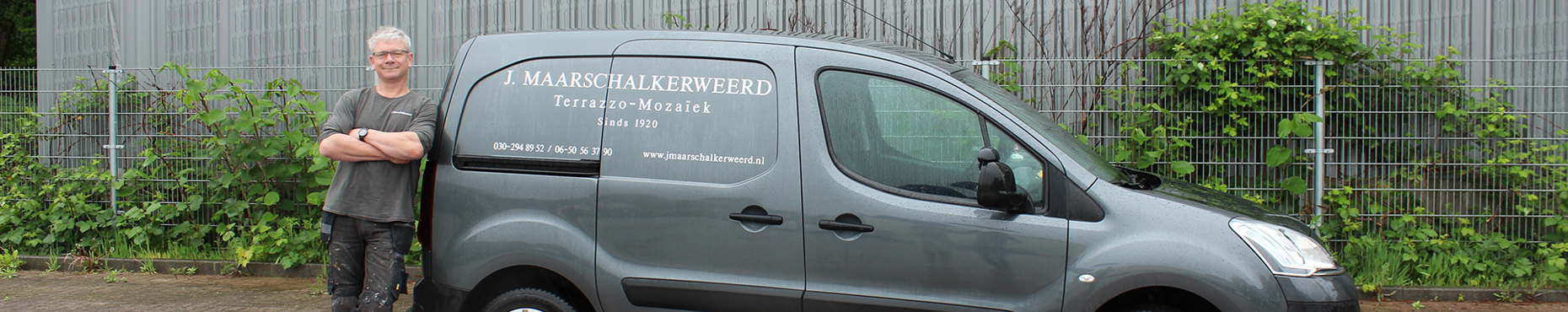 Op de bedrijfsvoorraad van Fa. J. Maarschalkerweerd & Zn uit Utrecht staan 2 bedrijfswagens. Afhankelijk van de werkzaamheden en locatie waar hij aan de slag gaat, neemt Jillles zijn compacte Berlingo of de grote Fiat bus. In de ene heeft hij alle machines en gereedschappen om Terrazzo te schuren, in de andere alles voor restauratiewerk en het aanbrengen van aanrechtbladen en vloeren. “Als ik ergens in de binnenstad moet zijn, parkeert het veel makkelijker met mijn compacte bestelwagentje. Heb ik veel en zwaar materiaal of gereedschap mee te nemen, dan pak ik mijn bus. Bij mij heeft iedere klus z’n eigen bus”, lacht Jilles Maarschalkerweerd.