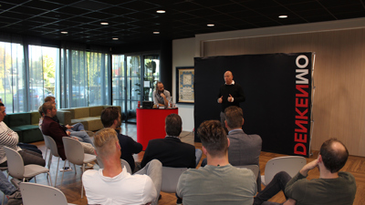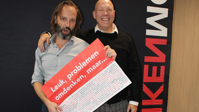 Na een snelle rondleiding door het gebouw hadden Dave en Dion van Omdenken hun decor opgebouwd en werd de omdenkshow gestart. Aan de hand van praktijksituaties werd geschetst dat het belangrijk is om de energie van een probleem te gebruiken om er een mogelijkheid van te creëren. Omdat hierbij de wenkbrauwen werden gefronst, werd allereerst de gebruikelijke denkwijze van ons brein getest. De groep kreeg een probleem voorgelegd, waar allerhande oplossingen voor mochten worden gedacht. Maar iedere aangedragen oplossing kon door Dave en Dion ook weer zo worden doorgedacht, dat het probleem vervolgens een ramp leek. Daarom adviseerden de omdenkers te stoppen met wat níet werkt.