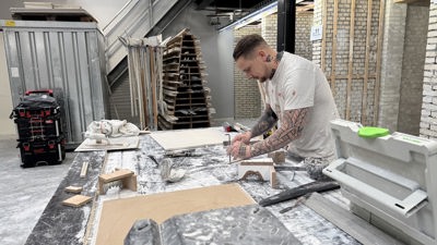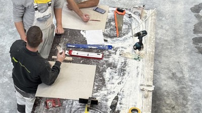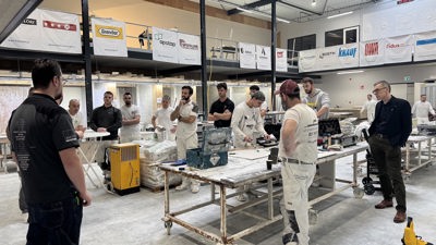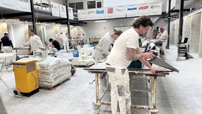 Jogan Jevtjajev vertelt hoe hij als kind al een fascinatie voor verschillende soorten gestucte muren ontwikkelde. “Ik moest altijd precies weten hoe iets gemaakt was. En nu wil ik gewoon alles van het vak weten wat er te weten valt. Ja, het is wel een beetje een obsessie voor me. Ik ben supertrots dat ik dit kan en mag doen.” Dylan Fernhout en Bryan Blom, samen aan een tafel bezig met slijpwerk aan hun profiel, werden al tijdens hun opleiding aan het mbo door hun docent apart genomen omdat die een bijzonder talent in ze herkende. “Dit vak kan zoveel meer zijn dan een wit muurtje. Dat wil ik graag allemaal onder de knie krijgen”, zegt Dylan. Bryan vult aan: “Als we deze opleiding af hebben zijn we meer kunstenaar dan stukadoor denk ik. Je leert zoveel verschillende aspecten en technieken. En op deze manier dragen we ook een steentje bij aan het in stand houden van ons vak. Dat vind ik ook belangrijk. Dat we later onze kennis weer kunnen doorgeven aan een nieuwe generatie.”