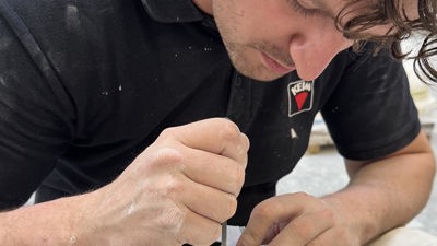 Tijdens de tweede les van de driejarige opleiding gaf een medewerker van metaalbewerkingsbedrijf AMTO een korte workshop over het op de juiste manier verspanen van verschillende soorten metaal die stukadoors gebruiken bij het maken van een profiel. De deelnemers kregen uitleg over de juiste boren en vijlen en hoe dat gereedschap het beste kan worden gebruikt. Docent Loïs Vlasblom: “Een Meester Stukadoor moet heel snel heel veel ‘zinkjes’ (malletjes, red.) kunnen maken. Daar moet je handigheid in krijgen. Dan is het handig als je weet wat het juiste gereedschap is en hoe je dat moet gebruiken.”