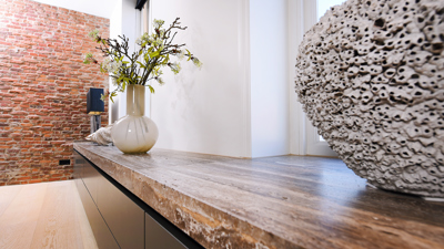 In hun woning wilden de eigenaren natuursteen toepassen om elke ruimte een unieke uitstraling te geven. Vanuit hun professionele expertise hadden ze al een relatie met Ariës Natuursteen in Zevenaar, dus was de keuze eenvoudig om daar hun wensen te bespreken. Bob Even is accountmanager bij Ariës en vertelt enthousiast over hun werkwijze en de toegepaste materialen: “Eenieder die onze showroom binnenwandelt, geven we graag uitgebreid advies en uitleg over de verschillende materialen. Er zijn verschillende soorten natuursteen, die allemaal op verschillende manieren kunnen worden afgewerkt. Het is daarom heel belangrijk om vooraf goed door te spreken of de voorkeursmaterialen passen bij het uiteindelijke gebruik. Om een voorbeeld te noemen: als een klant valt voor strak en stralend en vertelt een echte poetser te zijn, dan weten wij dat zo iemand uiteindelijk niet gelukkig wordt van een aanrechtblad dat niet zuurbestendig is. In Zuid-Europa is het volledig geaccepteerd dat marmeren aanrechtbladen in het gebruik hier en daar een vlekje of krasjes krijgen. Nederland is een ‘poetsland’ en hier willen we geen aantasting van zuren op het werkblad. Die zitten onder meer in citroen, of gin-tonic. Door klanten hier uitgebreid over te adviseren en in de showroom te laten zien hoe een steensoort er na zoeten en polijsten uitziet, wordt een realistisch beeld geschetst van het mogelijke eindresultaat.”