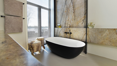 In de badkamer van een prachtig gerenoveerde monumentale villa is met Silver Roots marmer uit Turkije deels ‘Open Boek’ toegepast aan de wand. Met oog voor detail loopt de fraaie adering perfect over in de verschillende platen. Met zo’n uitzicht heb je in bad geen boek nodig…