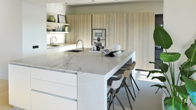 In de moderne keuken is gekozen voor Calacatta Brazil kwartsiet. “Deze melkwitte steensoort wordt ook wel Monte Bianco genoemd”, legt Bob uit. “Wij vinden het een probleemloze steensoort. Calacatta Brazil heeft meestal een rustige adering, waardoor het in veel verschillende interieurs past. In deze setting geven het kookeiland en aanrechtblad een prachtige match met de moderne keuken enerzijds en het karakteristieke karakter van de monumentale villa anderzijds.”