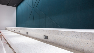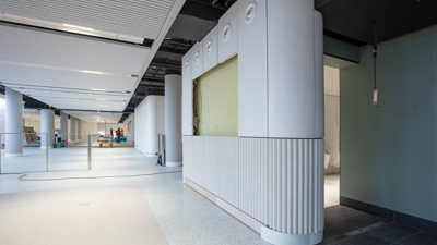 Kwakman trad op als multidisciplinair afbouwpartner en leverde één aanspreekpunt voor een brede scope: binnenwanden en plafonds, tegelwerk, schilderwerk, stucwerk, brandpreventie en omvangrijke interieurbouw. Opvallend maatwerk zat in aluminium: “We hebben aluminium wandpanelen en zogeheten coves rond de plafondeilanden gemaakt,” zegt Kok. “Dat waren echt ‘special made’ items. We zijn met de aluminiumleverancier gaan kijken: hoe verbeteren we dit, zodat we het efficiënt kunnen produceren en monteren. Daar zijn wijzigingen uitgekomen die zijn doorgevoerd en akkoord bevonden.”