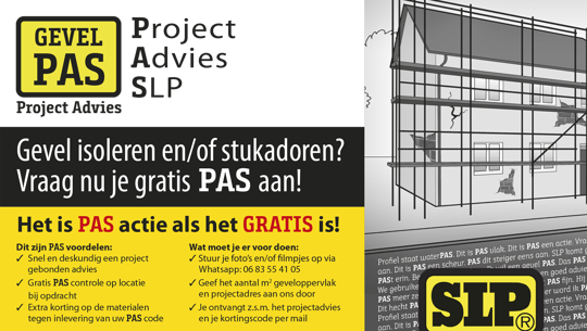 Omdat de kostprijs van een ter plaatse, door een technisch adviseur, gemaakt advies enorm gestegen is, heeft begunstigend lid SLP Afbouwstoffen een gratis alternatief bedacht. Op basis van ingezonden foto’s, filmpjes en een uitgebreide telefonische check wordt een PAS-advies gegeven, die als onderlegger kan dienen voor een uit te brengen offerte.